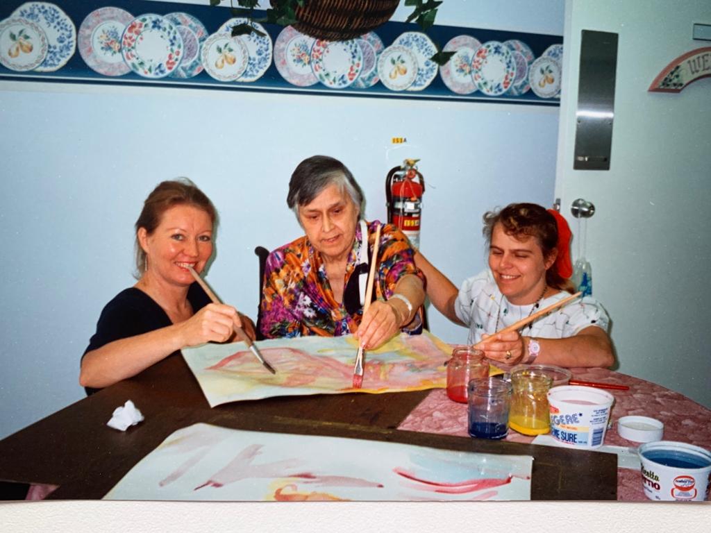 Com uma senhora idosa de 96 anos com artrite avançada e seus amigos em visita em Florianópolis, Brasil;